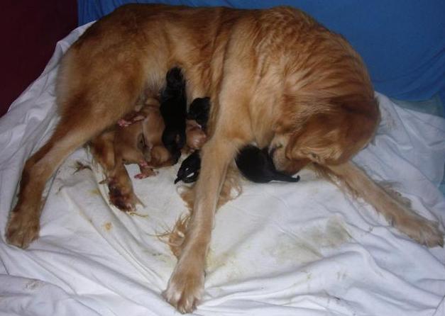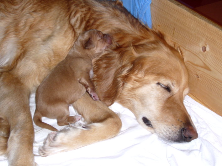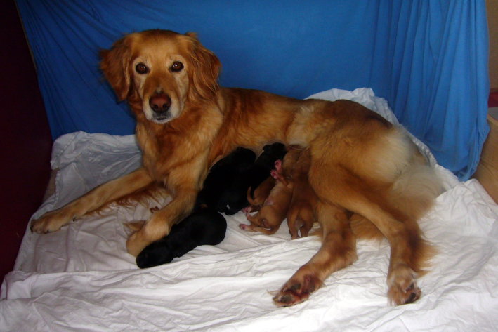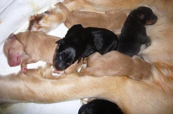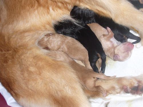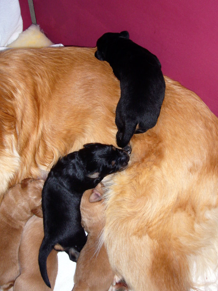 Weitere 5 folgten im Verlauf der Nacht. Anjou hat 3 blonde und 2 schwarz-markene Hündinnen außerdem einen schwarz-markenen Rüden zur Welt gebracht, die gleich ihren Platz an der "Milchbar" gefunden haben! Alle sind wohlauf und wir sind sehr glücklich, dass wir so viel Beistand hatten und alles so gut geklappt hat (vielen Dank liebe Inge und vielen Dank auch dir Peter für deine Unterstützung :-))!!!! Heute wird erst einmal viel geschlafen! Mal sehen, was und die kommenden Tage bringen - wir freuen uns darauf!