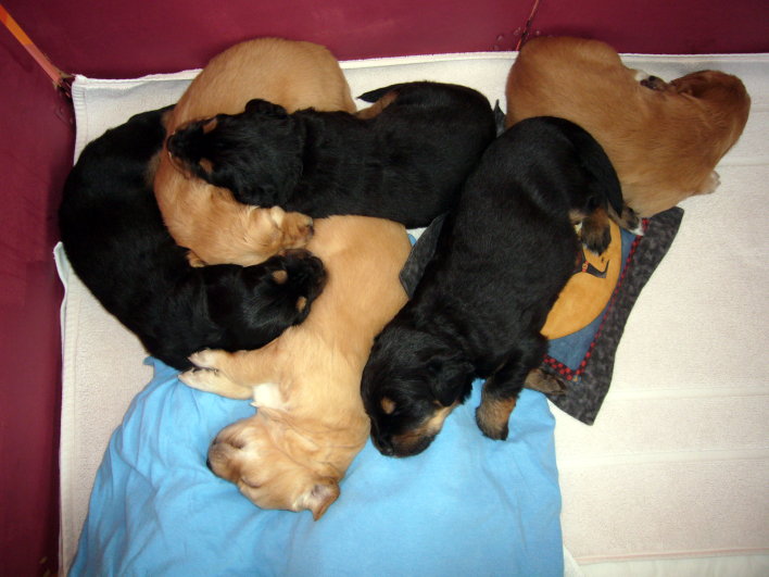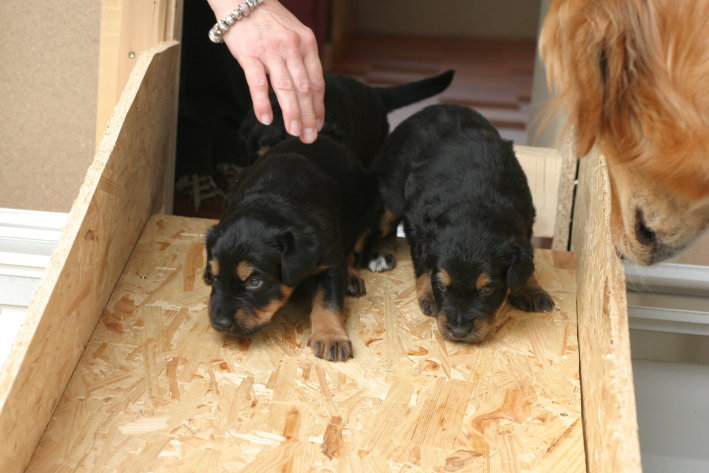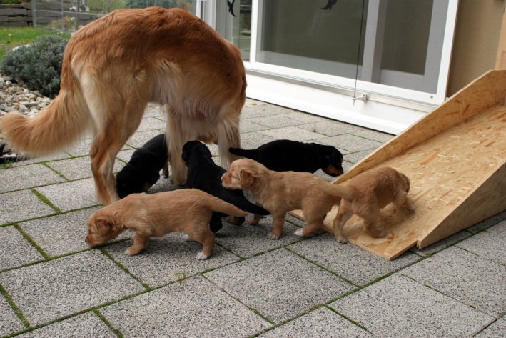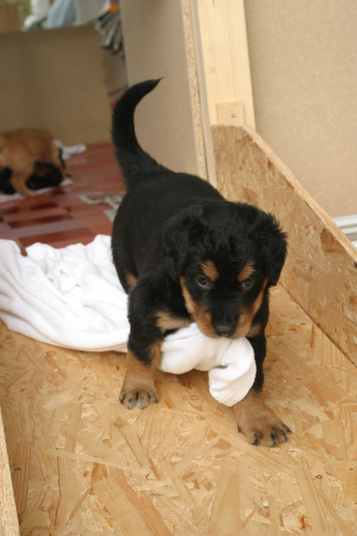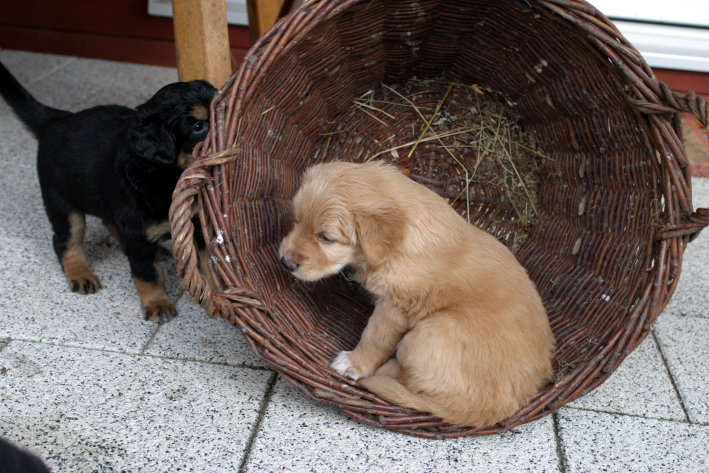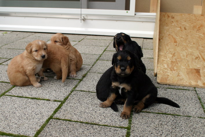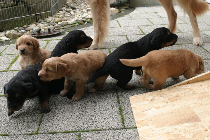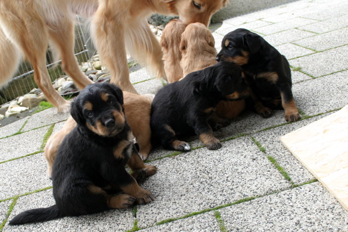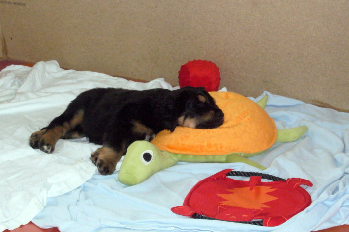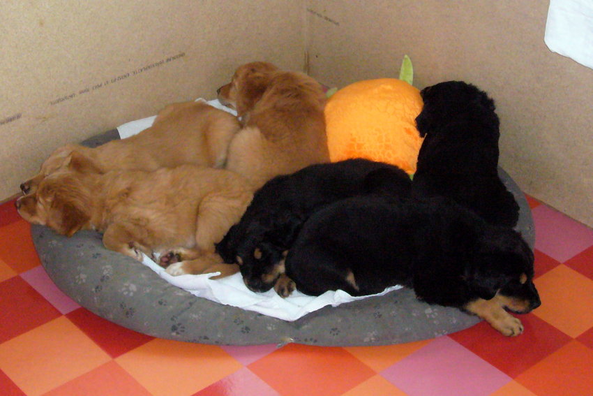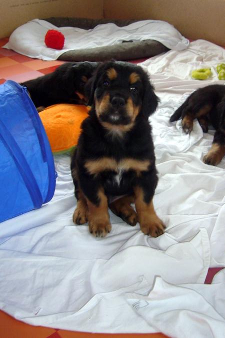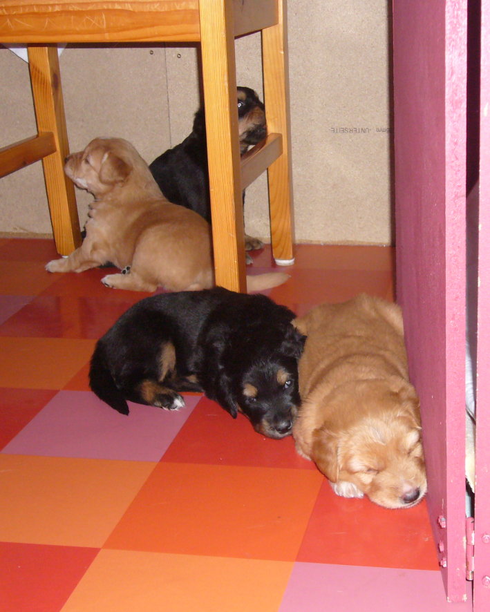 Wir sind weiterhin sehr damit beschäftigt die Welt kennen zu lernen. Am Samstag durften wir sogar das erste Mal in die Sonne - war das aufregend!!! Gestern und heute haben wir unsere ersten Besucher kennen gelernt. Die waren wirklich sehr nett und unsere Mama fand sie auch in Ordnung. Unsere Welpenkiste können wir jetzt eigenständig verlassen. Da kann man sich was zum Spielen suchen, oder sich einfach mal in eine ruhigere Ecke zurück ziehen und ein Nickerchen halten. Und das tun wir jetzt!