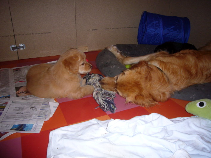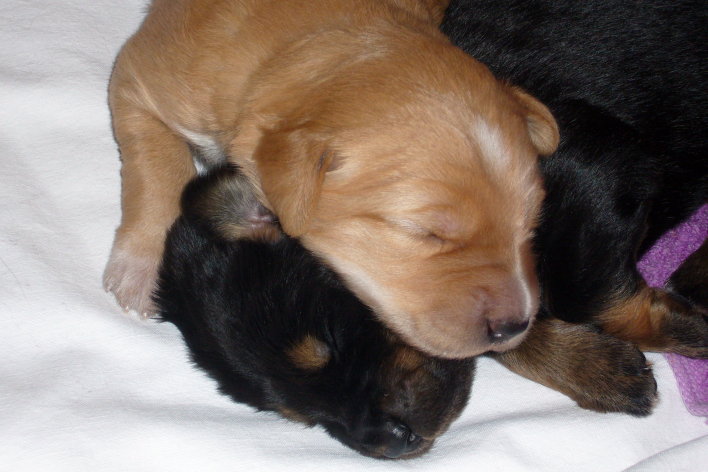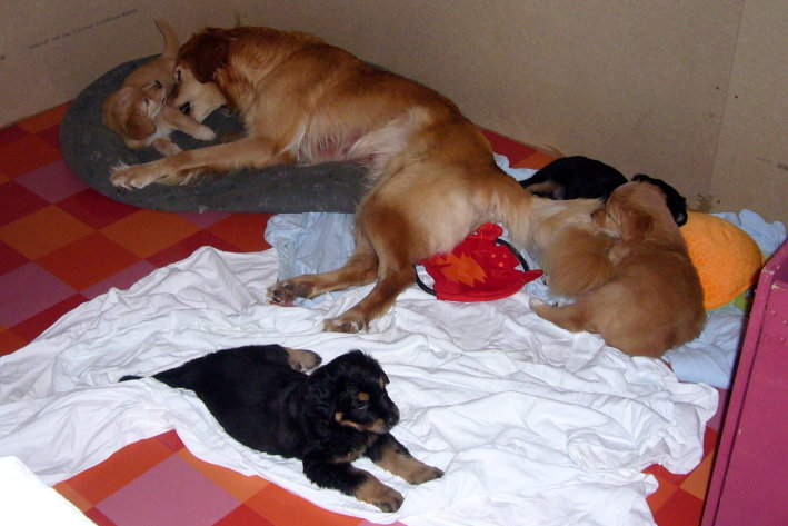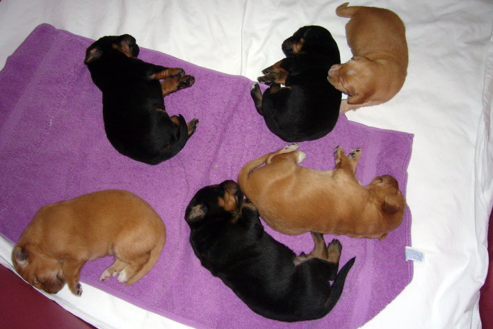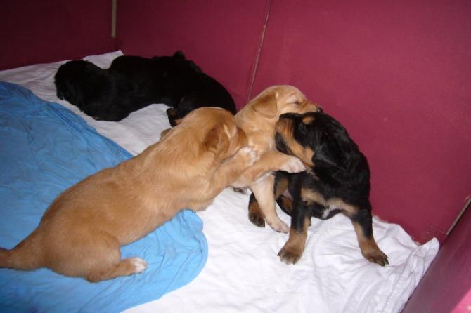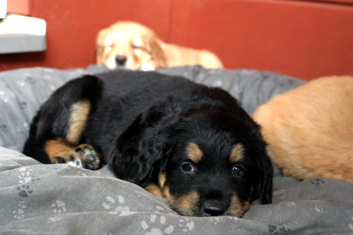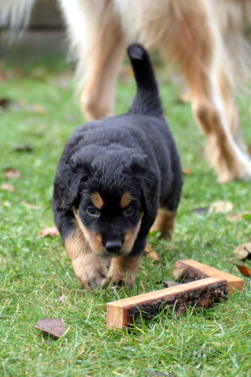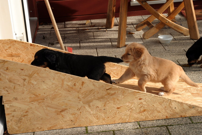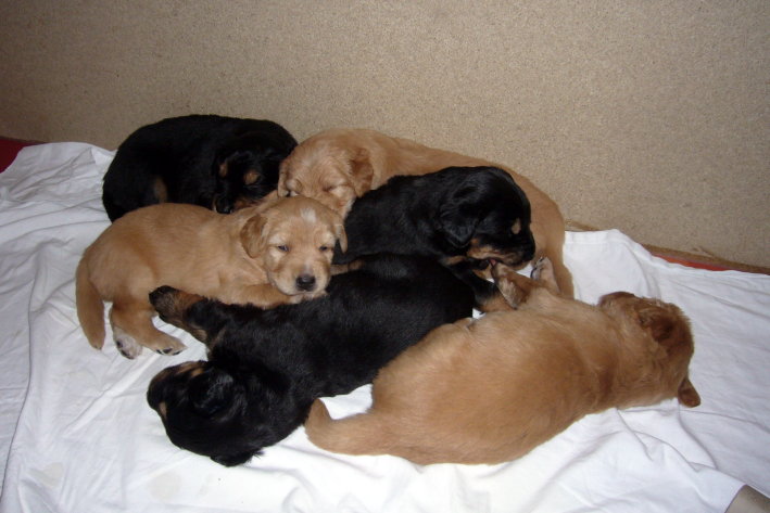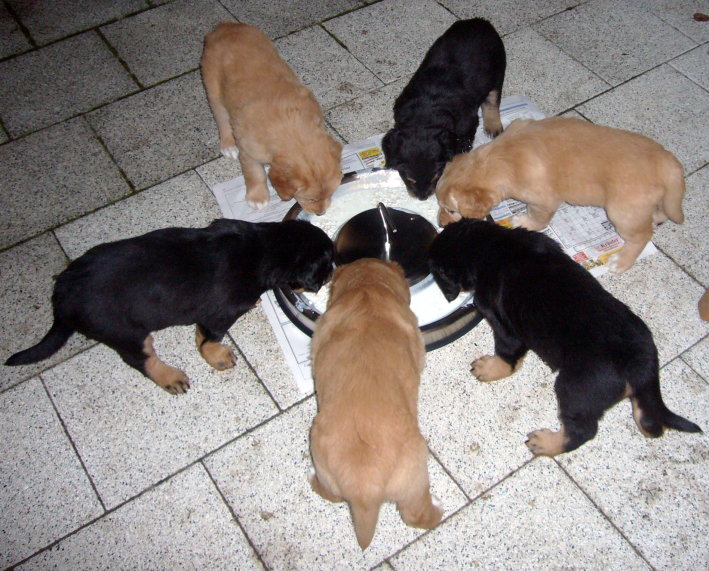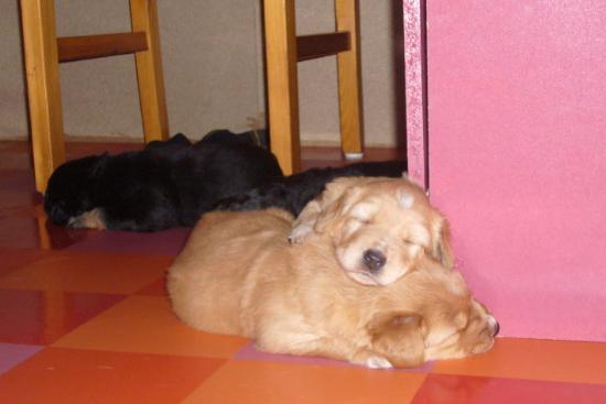 Wir sind weiterhin sehr damit beschäftigt die Welt kennen zu lernen. Am Samstag durften wir sogar das erste Mal in die Sonne - war das aufregend!!! Gestern und heute haben wir unsere ersten Besucher kennen gelernt. Die waren wirklich sehr nett und unsere Mama fand sie auch in Ordnung. Unsere Welpenkiste können wir jetzt eigenständig verlassen. Da kann man sich was zum Spielen suchen, oder sich einfach mal in eine ruhigere Ecke zurück ziehen und ein Nickerchen halten. Und das tun wir jetzt!