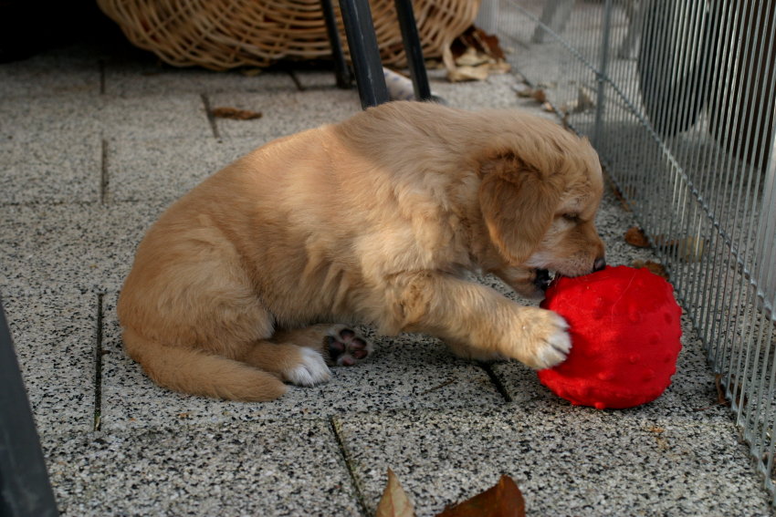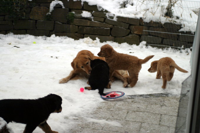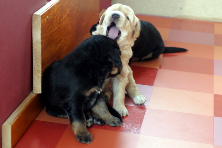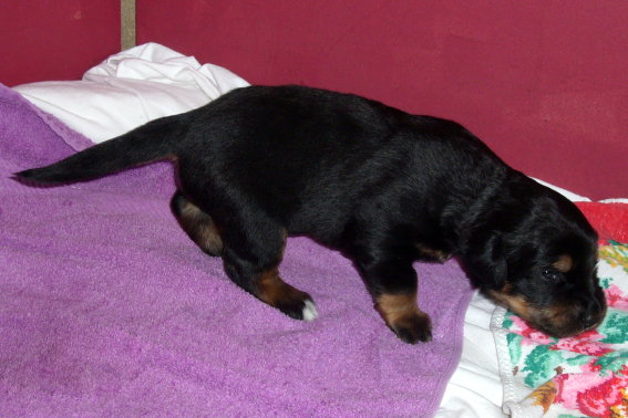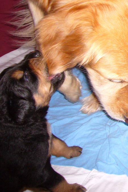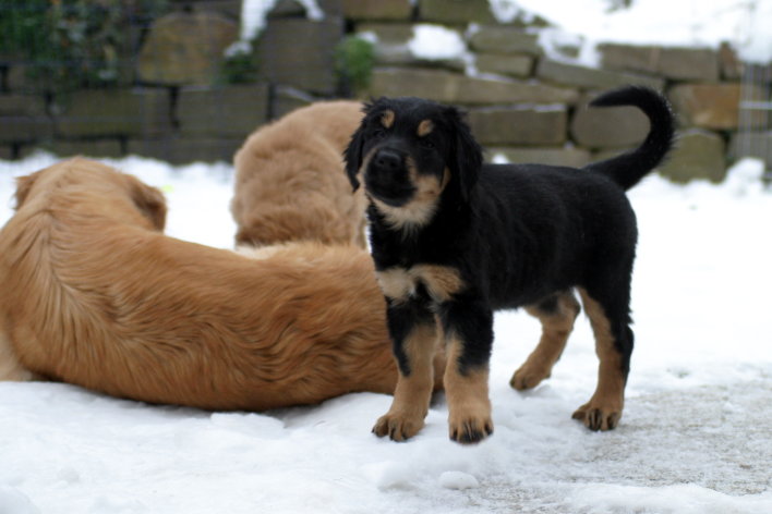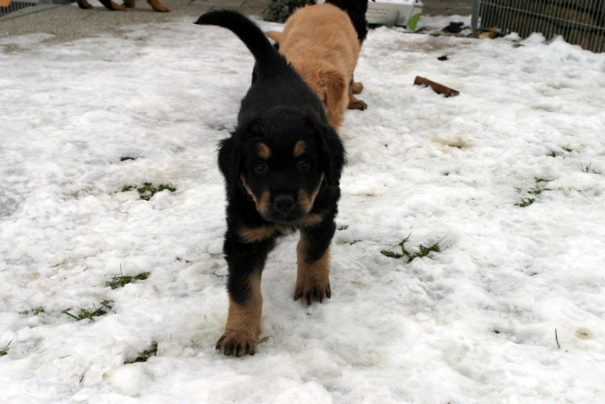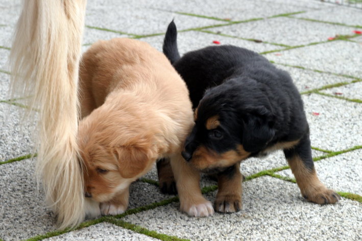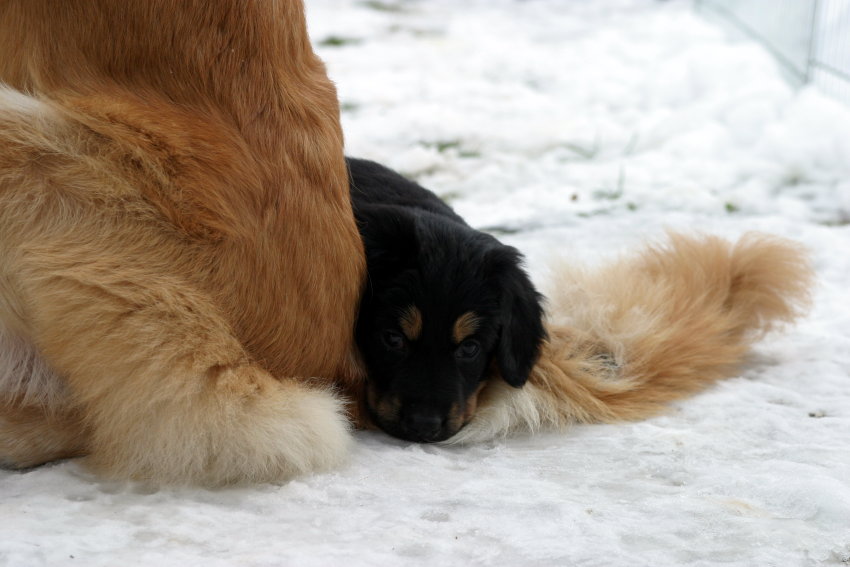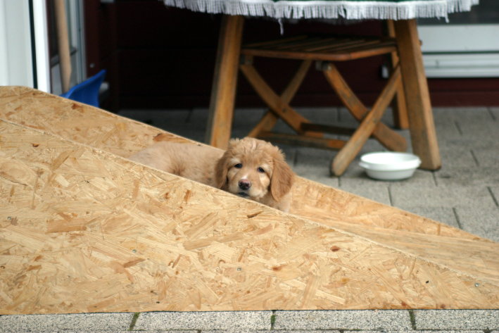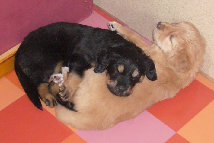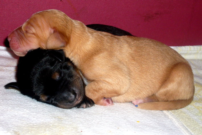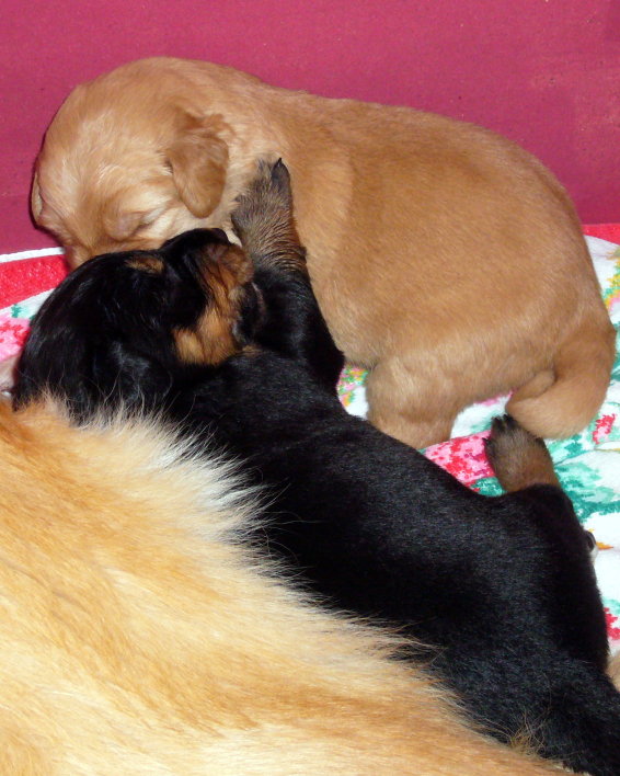Wir sind weiterhin sehr damit beschäftigt die Welt kennen zu lernen. Am Samstag durften wir sogar das erste Mal in die Sonne - war das aufregend!!! Gestern und heute haben wir unsere ersten Besucher kennen gelernt. Die waren wirklich sehr nett und unsere Mama fand sie auch in Ordnung. Unsere Welpenkiste können wir jetzt eigenständig verlassen. Da kann man sich was zum Spielen suchen, oder sich einfach mal in eine ruhigere Ecke zurück ziehen und ein Nickerchen halten. Und das tun wir jetzt!