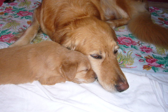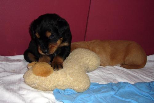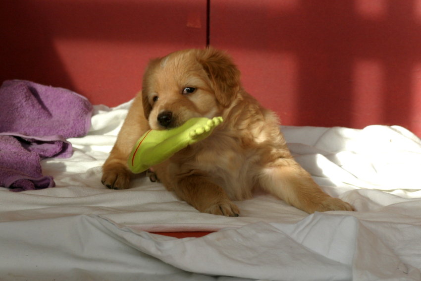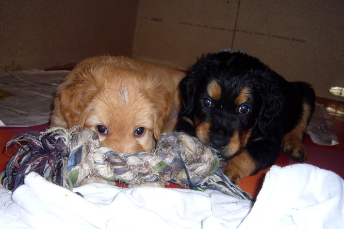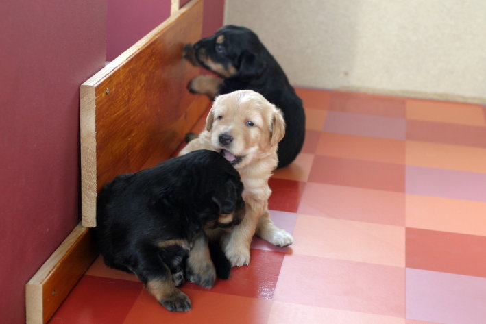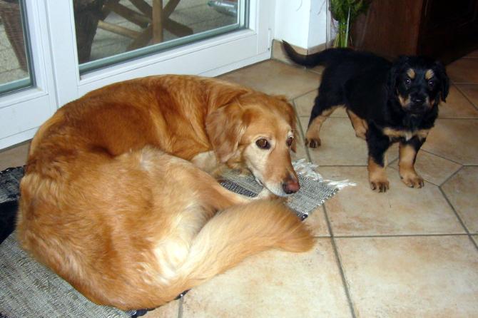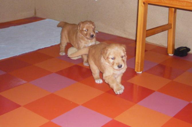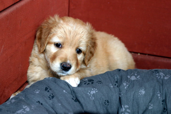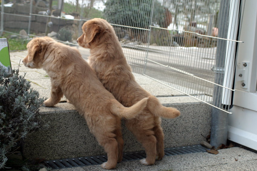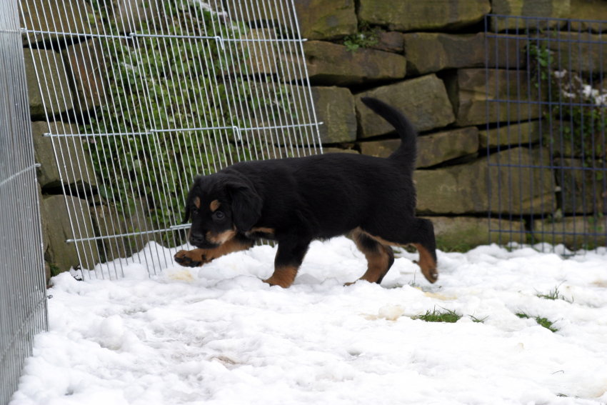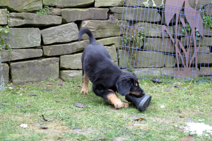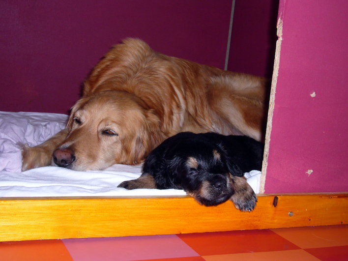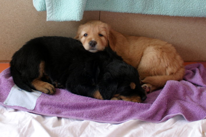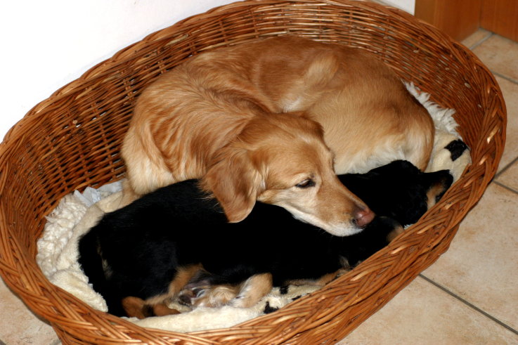 Wir sind weiterhin sehr damit beschäftigt die Welt kennen zu lernen. Am Samstag durften wir sogar das erste Mal in die Sonne - war das aufregend!!! Gestern und heute haben wir unsere ersten Besucher kennen gelernt. Die waren wirklich sehr nett und unsere Mama fand sie auch in Ordnung. Unsere Welpenkiste können wir jetzt eigenständig verlassen. Da kann man sich was zum Spielen suchen, oder sich einfach mal in eine ruhigere Ecke zurück ziehen und ein Nickerchen halten. Und das tun wir jetzt!