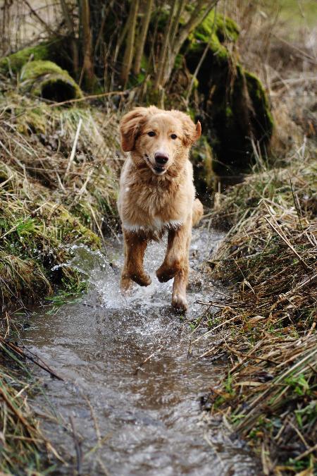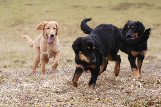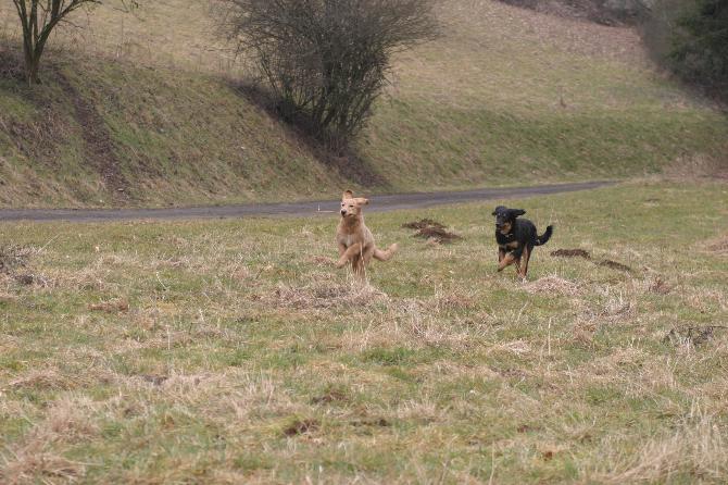 Die Ausflüge nach draußen sind immer toll. Egal ob es regnet oder windig ist - wir haben unseren Spaß, denn es gibt dort jede Menge zu entdecken. Man kann sich verstecken, mit dem Ball spielen, ein Blatt im Wind fangen und was ganz wichtig ist: diverse kleine und große Geschäfte auf der Wiese erledigen! Das muss auch sein!